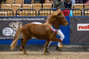 Mit jeweils 8,12 gab es zwei punktgleiche Reservesieger – den dreijährigen Fuchshengst Kjalar vom Barghof(V: Kristall från Skaneyland) vorgestellt von Nils Paustian sowie den vierjährigen Braunschecken Sesar von Vierthohen (V:Kiljan frá Steinnesi) aus der Zucht der Familie Peters.